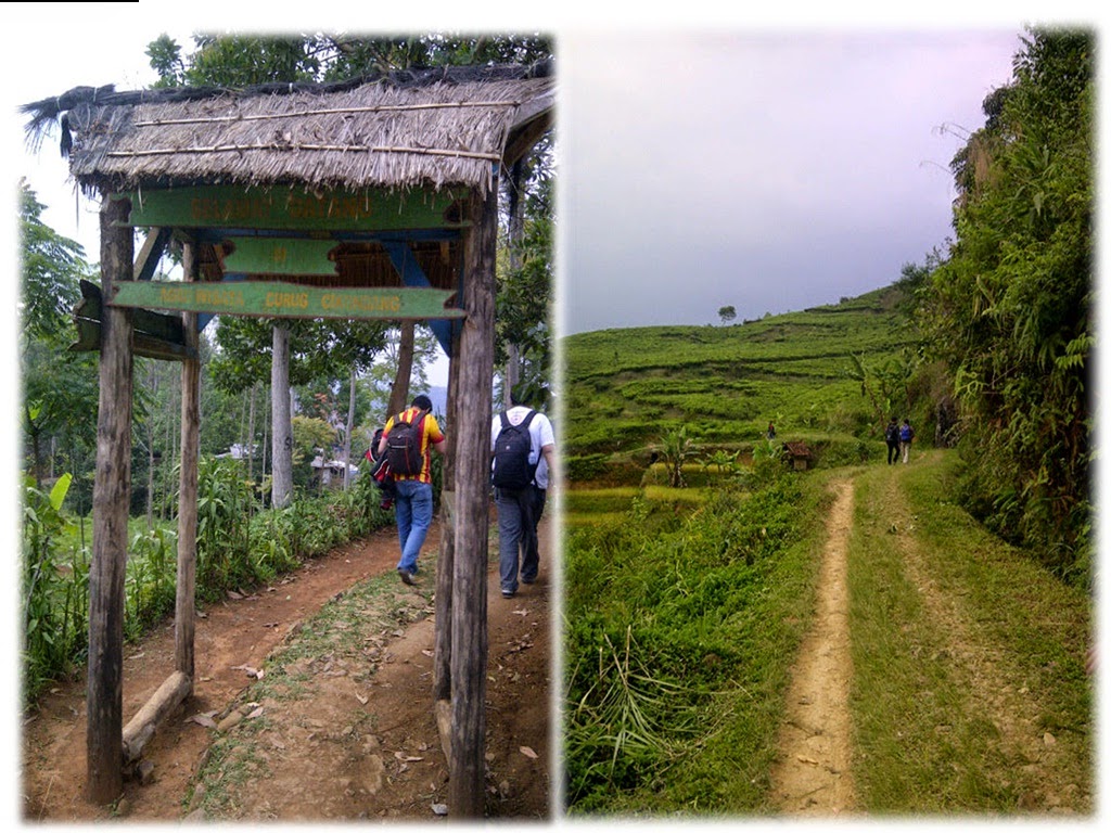 jalan setapak yang terbentang akan membawa kita memasuki area persawanan dan kebun teh, Selain itu saat anda menuruni bukit dan berjalan di tengah tengah kebun teh, kebetulan saaat kami kesini pada tanggal 25 Padi di persawahan tersebut sedang menguning. Nampak pada gambar jalan setapak yang akan dilalui menuju curuk cikondang.