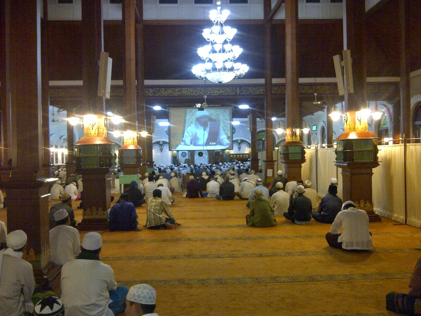 Ketika saya memasuki ruang untuk menunaikan sholat isya dalam masjid ini, perbedan susasana sangat kental di sini hawa damai dan tenang mengalir ketika berzikir di dalam masjid ini, entah percaya atau tidak namun ini lah yang terjadi. Ketentraman hati dan menurut saya tempat ini cocok untuk i'ktikaf, tiang besar berjumlah empat buah terbuat dari kayu jati dan 20 tiang/kolom yang bentuknya dibuat mirip dengan kolom asli itu.